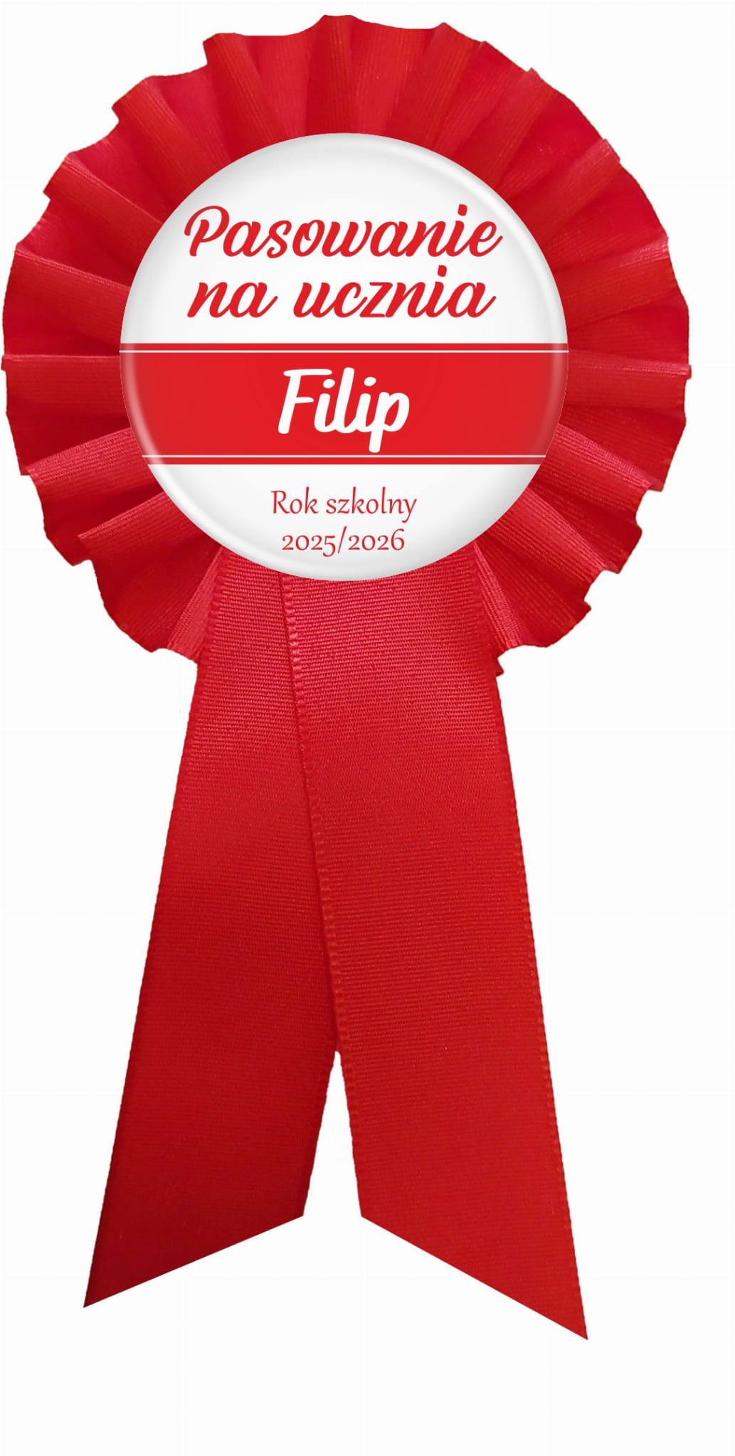 Czerwony kotylion z imienną przypinką na Pasowanie na ucznia