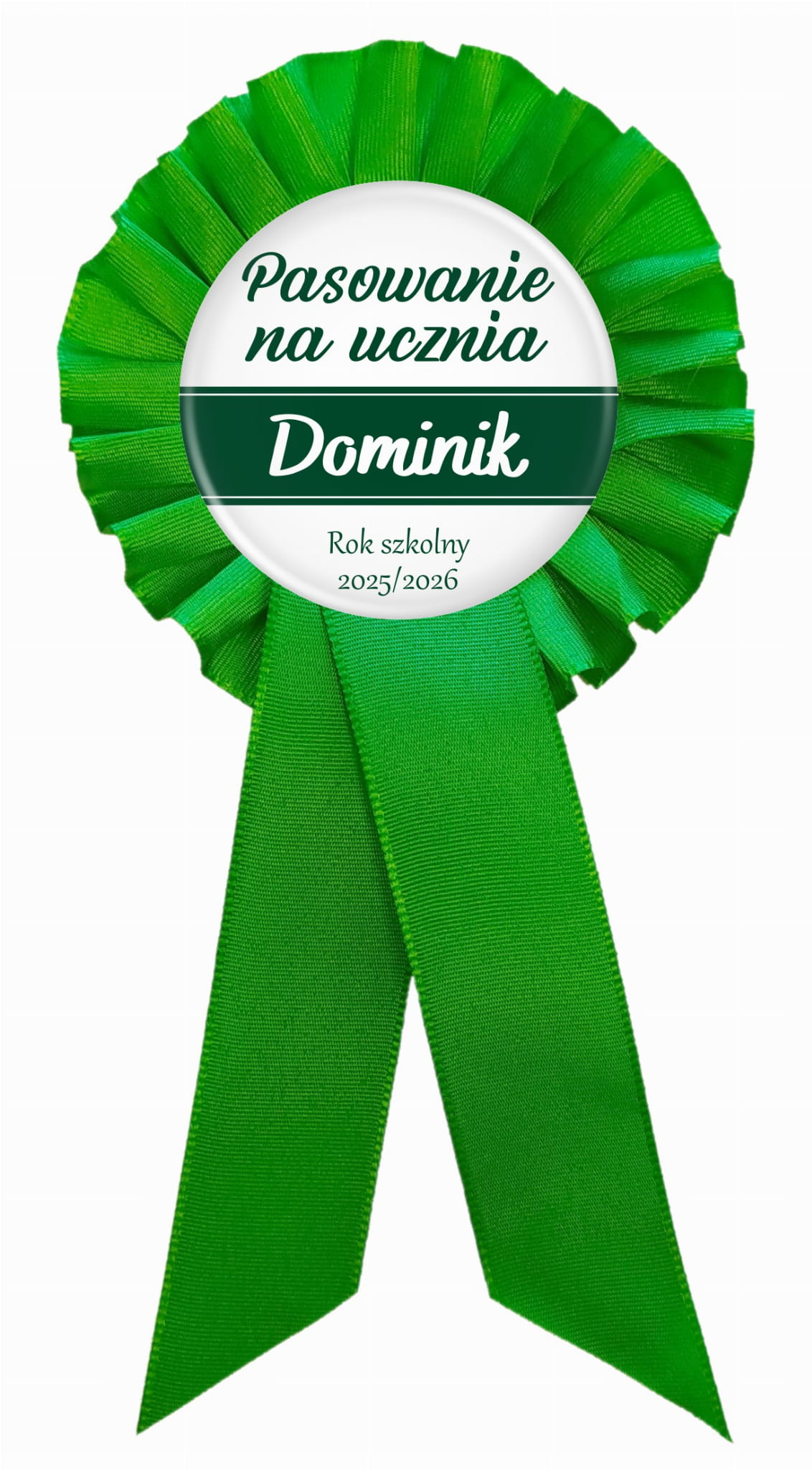 Zielony kotylion z imieniem ucznia na uroczystość Pasowania