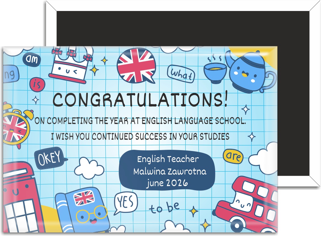 Kolorowy, personalizowany magnes z motywem szkoły językowej to pamiątka, która ucieszy każde dziecko kończące rok szkolny. Praktyczny, trwały i wyjątkowy – idealny jako upominek od nauczyciela języka angielskiego.