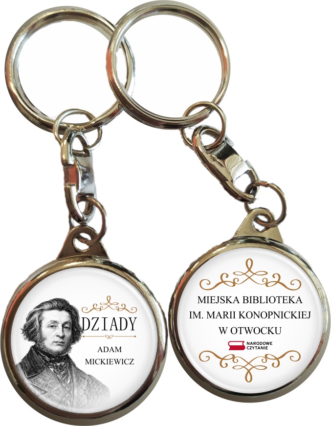Jedna strona breloka prezentuje klasyczny wizerunek Adama Mickiewicza z subtelnymi, ozdobnymi ornamentami i nazwą utworu. Druga strona została przeznaczona na nazwę biblioteki lub instytucji organizującej wydarzenie. Jasne tło i złote zdobienia nadają całości elegancki, ponadczasowy charakter, dzięki czemu brelok prezentuje się estetycznie i profesjonalnie.