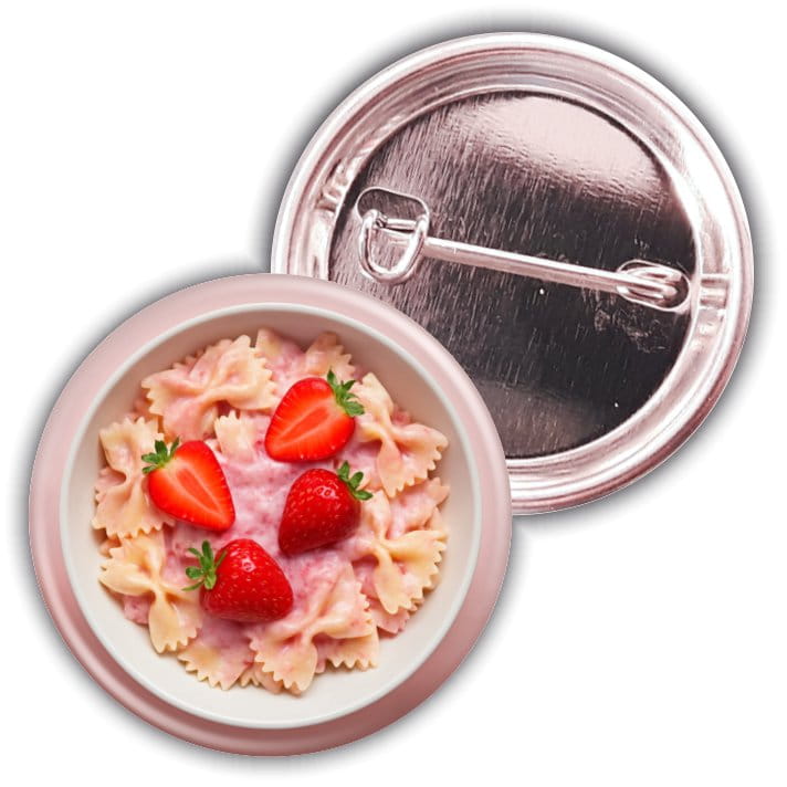 Kultowe danie dzieciństwa w formie przypinki? Dlaczego nie! Okrągła przypinka z apetyczną grafiką makaronu kokardki z sosem truskawkowo-jogurtowym i świeżymi owocami to propozycja dla wszystkich, którzy nie kryją swojej miłości do tej słodkiej klasyki. Uroczy różowy motyw i kulinarne skojarzenia sprawiają, że ten gadżet wywołuje uśmiech i... apetyt! Idealna na lato, do przypięcia na plecak, bluzę czy torbę – niech każdy wie, że makaron z truskawkami to Twoje comfort food!