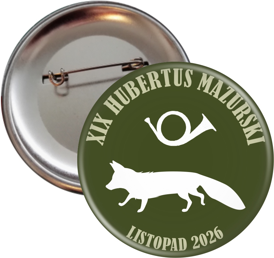 Przypinka z zielonym tłem. Na górze znajduje się napis z nazwą Hubertusa, natomiast na dole widnieje data. Po środku zamieszczone są dwie symboliczne grafiki - trąbki sygnałowej myśliwskiej oraz lisa. Przypinka w rozmiarze 56 mm zapinana na agrafkę.